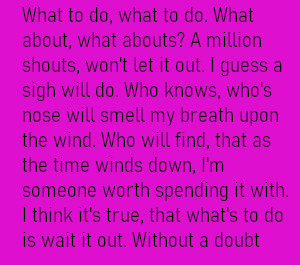 This poem was written here, put in ms paint to be posted to twitter, then taken back here in photo form so that it could be better read by my (nonexistant) audience. Fun! I'm thinking about my bestie and reading shimsim, it's weird, it's 2am, it's whatever, really, but it's fun. Rhymes are fun when they come (practically) naturally like they did tonight. I feel weird, but good weird. Here's what i wrote about it on twitter "Poetry is fun, I should do it more I think I think leaving it as a block adds a bit to it, the pauses can be felt with the periods. Spacing it out in lines always felt a bit silly and forced, the rhyme schemes can be a stretched a lot thinner like this."